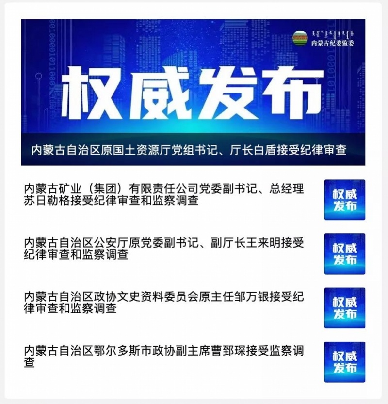 12月4日傍晚,内蒙古纪委监委一口气通报了5名厅官落马的消息,分别是:
