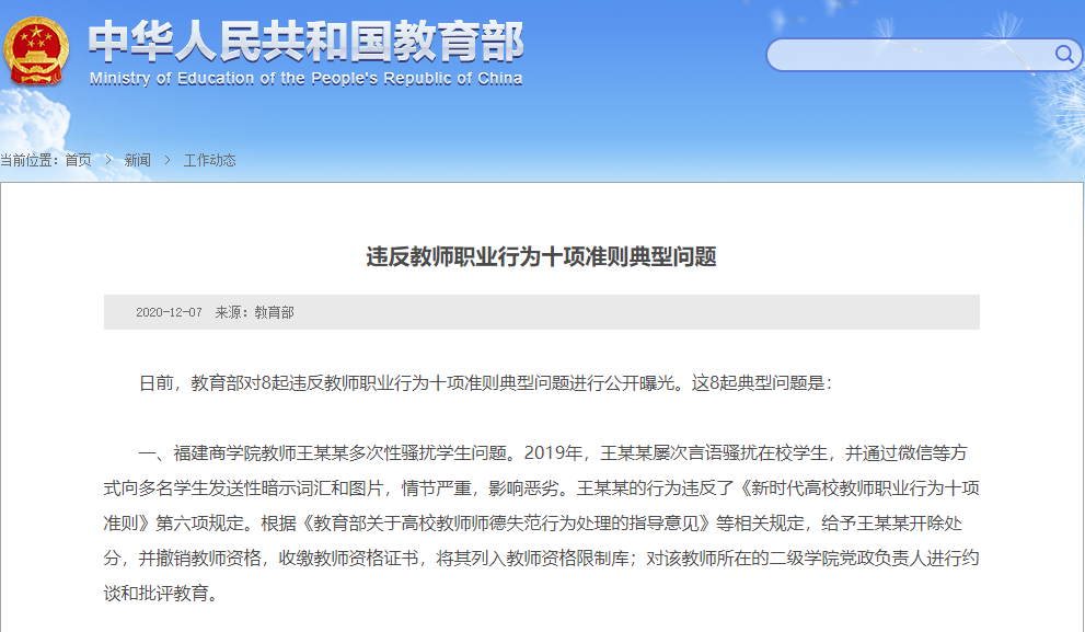 一、福建商学院教师王某某多次性骚扰学生问题。2019年,王某某屡次言语骚扰在校学生,并通过微信等方式向多名学生发送性暗示词汇和图片,情节严重,影响恶劣。王某某的行为违反了《新时代高校教师职业行为十项准则》第六项规定。根据《教育部关于高校教师师德失范行为处理的指导意见》等相关规定,给予王某某开除处分,并撤销教师资格,收缴教师资格证书,将其列入教师资格限制库;对该教师所在的二级学院党政负责人进行约谈和批评教育。