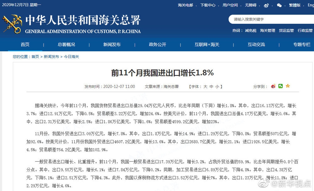【正正正!中国外贸连续三个月正增长】海关总署7日发布数据,前11个月,我国货物贸易进出口总值29.04万亿元,同比增长1.8%。这是继1至9月外贸进出口累计增速年内首次转正以来,连续第三个月保持正增长。给力!(记者刘红霞)