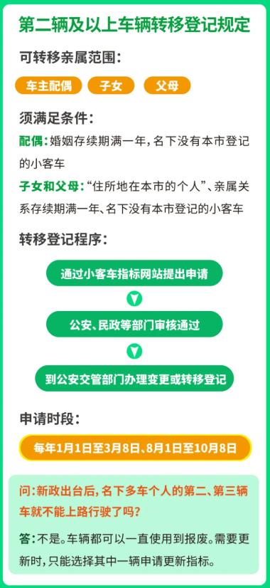 一人名下拥有多辆在本市登记的小客车的,车辆更新时可以选择其中1辆申请更新指标,其余车辆不予办理更新指标,但允许车主向其名下没有本市登记小客车的配偶、子女、父母转移登记多余的车辆,受让方无需指标证明文件,配偶需满足婚姻存续期满一年;子女和父母要符合“住所地在本市的个人”、亲属关系存续期满一年的条件。