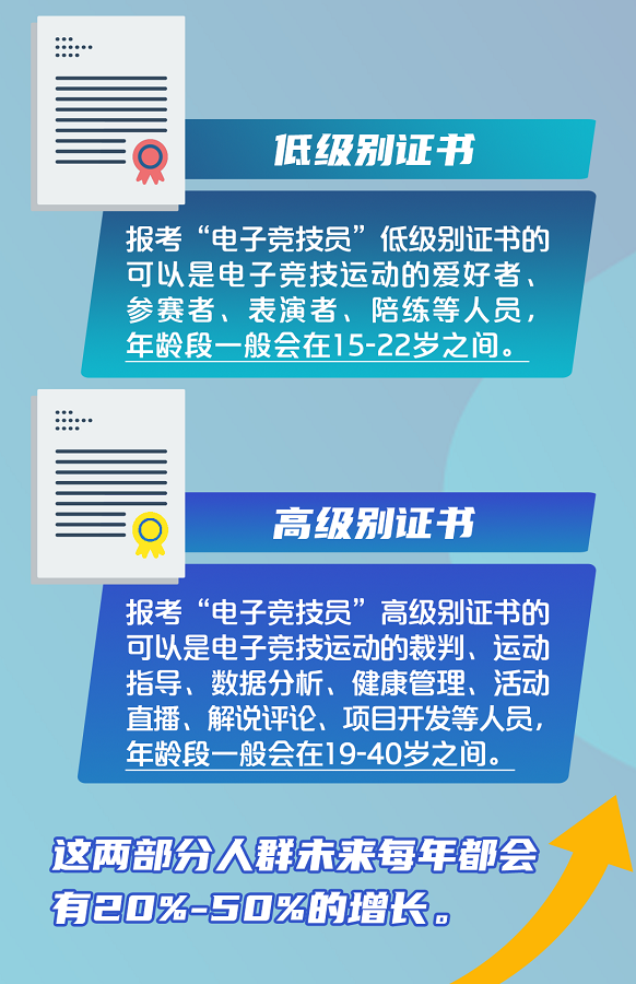 答:按照此次制定的“电子竞技员”国家职业技能标准,“电子竞技员”共设五个等级,分别为:五级/初级工、四级/中级工、三级/高级工、二级/技师、一级/高级技师。