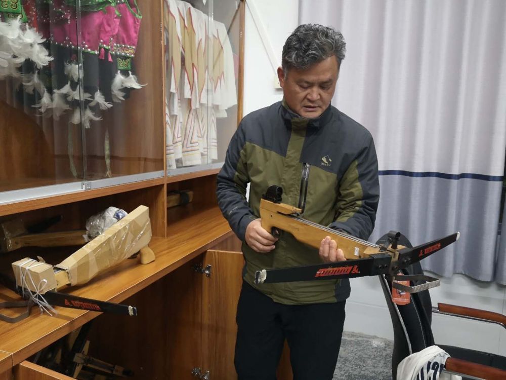 “如果不把器材拿出来,学生们连对项目的直观印象都没有。”石海春带记者走进器材室,但一些器材却无奈地被“藏”了起来——正式比赛使用的弩每把造价数万元,第一中学唯一的一把,被硬纸板和透明胶包裹得严严实实放在柜子里。学校只能退而求其次,请工匠做几把“复刻版”以供平时练习使用。