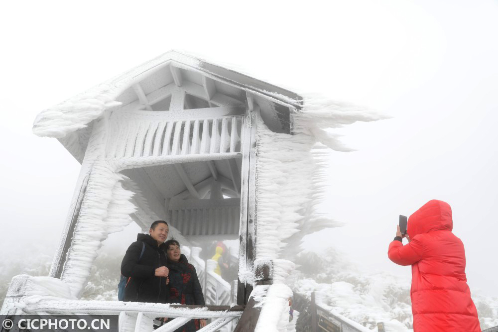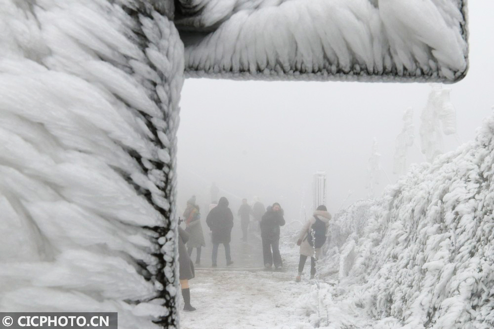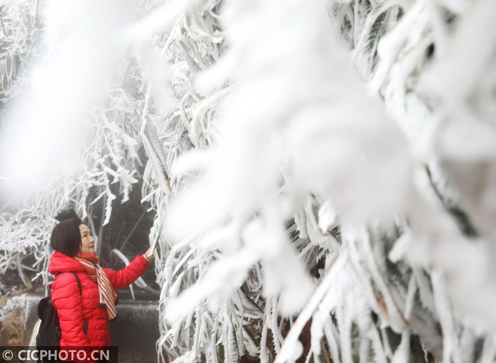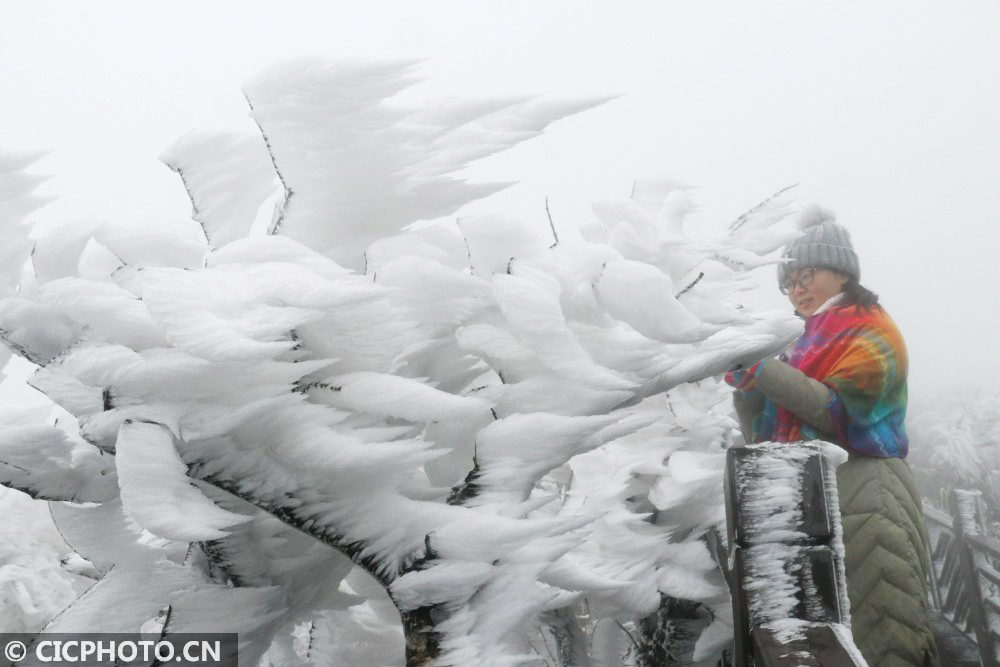 ↑2020年12月5日,湖南省永州市蓝山县云冰山景区,游客在欣赏雾凇。CICPHOTO/周凤连 摄