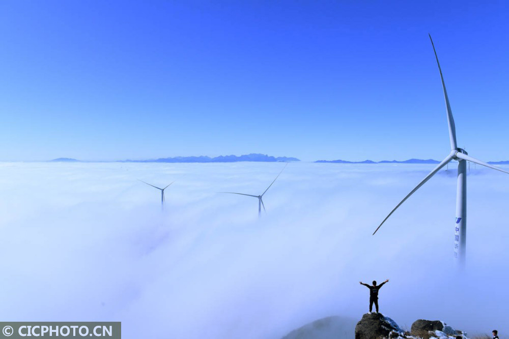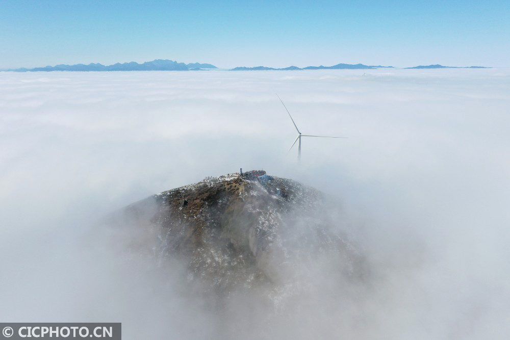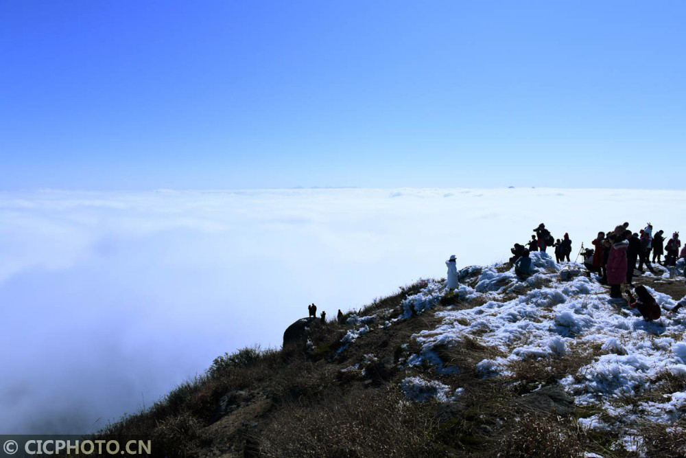 ↑2020年12月5日,湖南省永州市蓝山县云冰山景区,游客在欣赏云海美景。CICPHOTO/梁利 摄