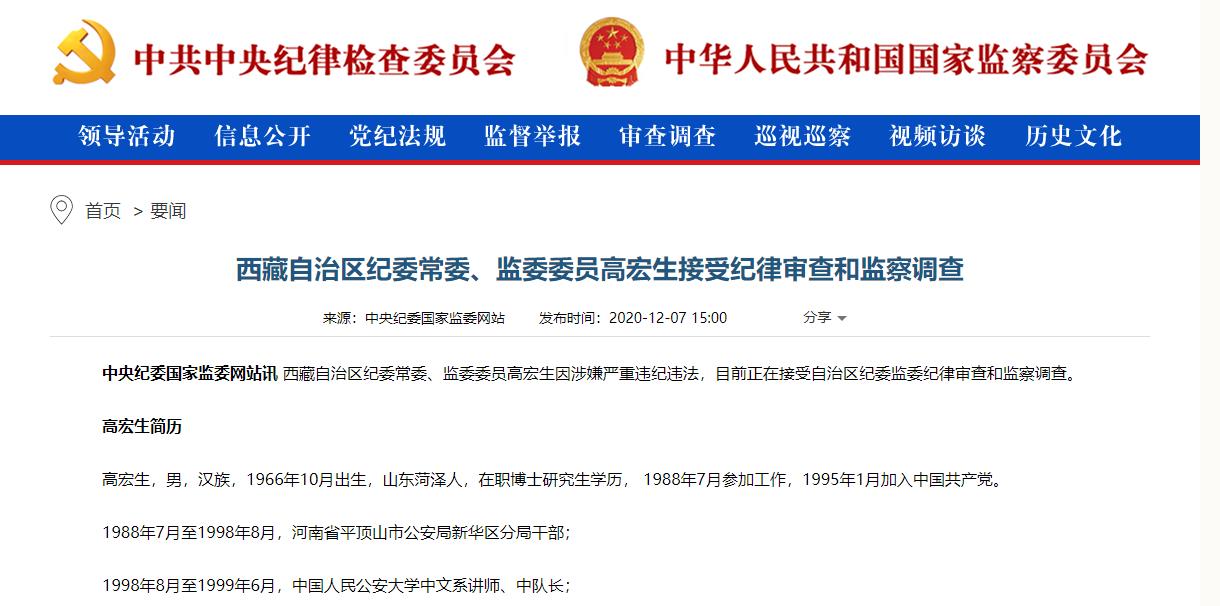 中央纪委国家监委网站讯:西藏自治区纪委常委、监委委员高宏生因涉嫌严重违纪违法,目前正在接受自治区纪委监委纪律审查和监察调查。