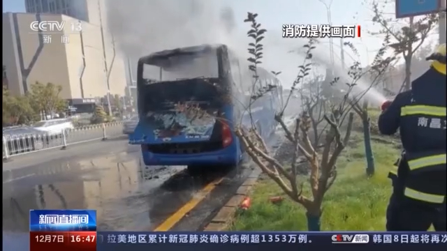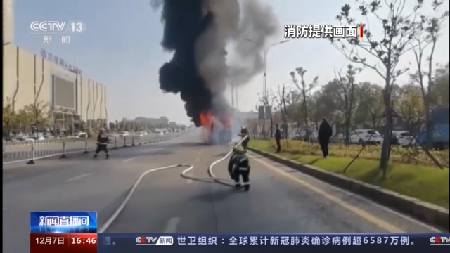 6日中午,在江西南昌新建区,一辆大巴车突然自燃。接到报警后,当地消防救援人员迅速赶赴现场处置。