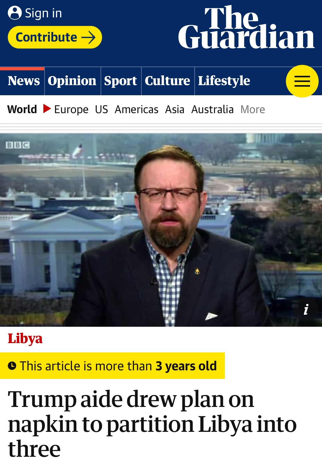 △英国《卫报》:“特朗普助手在餐巾纸上画出将利比亚一分为三的解决方案”。根据目前媒体公布的信息,美国总统特朗普外交政策上的前助手塞巴斯蒂安·高尔基最早提出了划分利比亚这一解决方案。2017年,他曾在一张餐巾纸上画出了一个分为三个区域的利比亚地图,并称这是解决利比亚冲突的唯一途径。