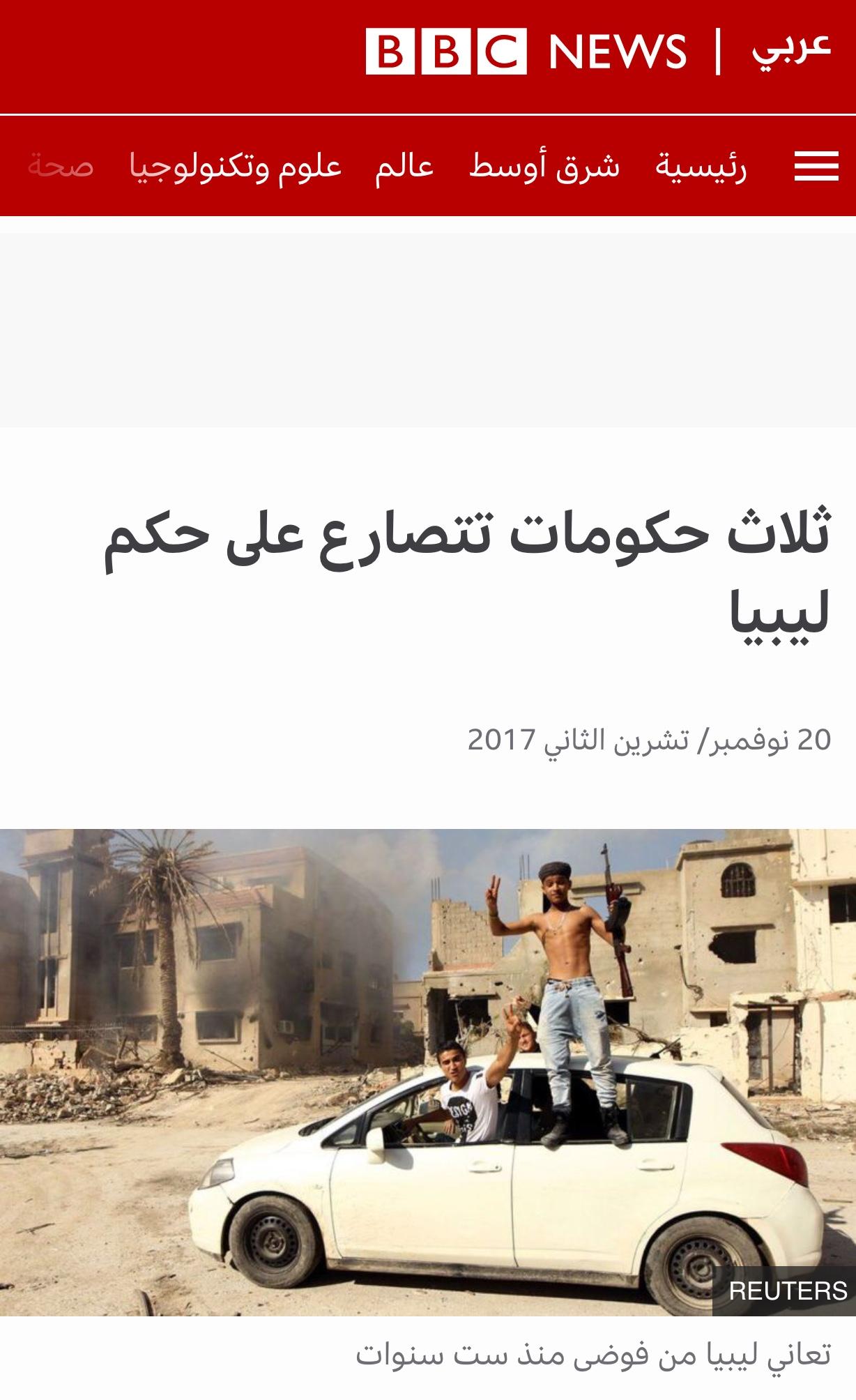 △BBC报道《三个政府在利比亚上演权力争夺》截图。2016年时,由于在新政府成员名单问题上存在分歧,利比亚救国政府以及利比亚东部临时政府均拒绝向受国际社会承认的利比亚民族团结政府移交权力,一度制造了一个国家同时出现三个政府的“奇景”。