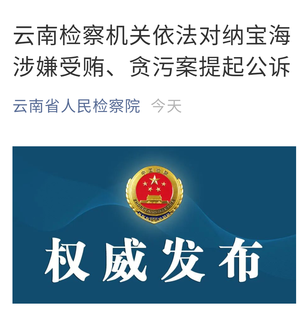 日前,云南省西双版纳傣族自治州勐海县原县委常委、政协党组副书记、统战部长纳宝海涉嫌受贿罪、贪污罪一案,由西双版纳州人民检察院向西双版纳州中级人民法院提起公诉。