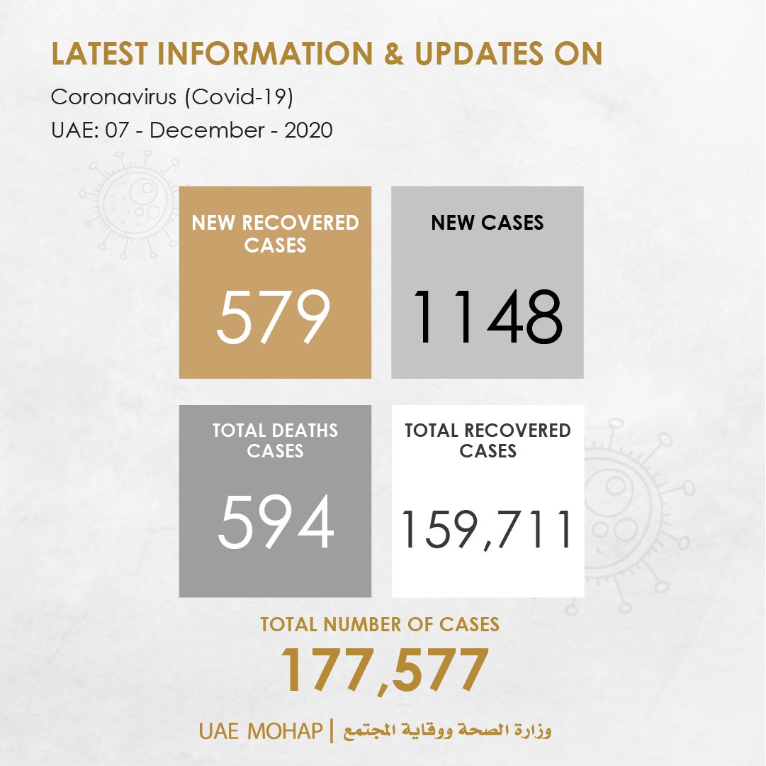 当地时间12月7日,阿联酋卫生和预防部通报该国新增1148例新冠肺炎确诊病例,同时新增579例治愈病例和2例死亡病例。
