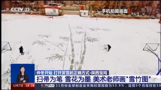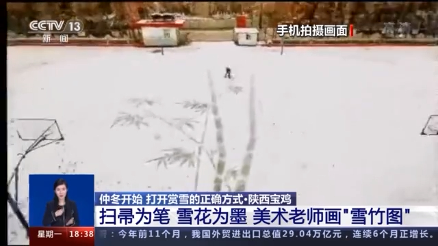 白雪无暇,秋去冬来,人生漫长,但总有一些人惊艳时光、温暖岁月。前几天,陕西宝鸡迎来降雪,一位小学美术老师在学校操场雪地上即兴创作了一幅雪竹图,扫帚为笔,雪花为墨,操场就是画板。在雪中,美术老师袁老师用扫帚在雪地上分别画出竹竿、竹枝和竹叶。