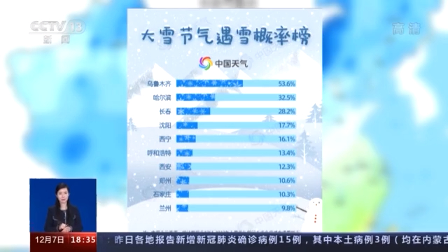 大雪节气,下雪的可能性也大增。中国这么大,这个时节哪里有可能看见雪呢?中国天气网统计了1951年至2019年省会级城市的降雪数据,大雪节气期间,乌鲁木齐平均降雪日数能达到8天,遇雪概率超过五成;哈尔滨和长春在大雪节气期间的遇雪概率大约为三成。