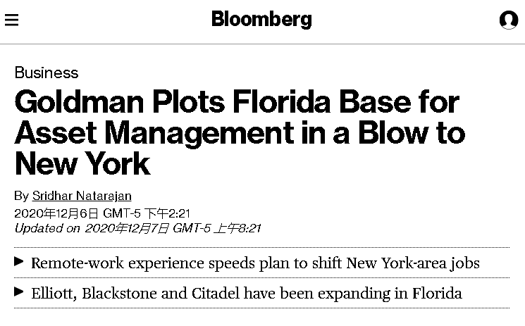 △彭博社称,高盛计划在佛罗里达州建立资产管理基地,对纽约金融中心地位形成冲击