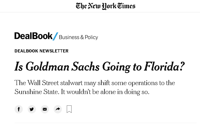 △《纽约时报》称,华尔街巨头高盛可能会将一些业务转移到佛罗里达州,它不会是唯一一个这样做的企业