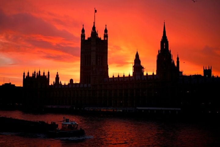 这是12月4日在英国伦敦拍摄的落日余晖下的议会大厦。新华社/法新