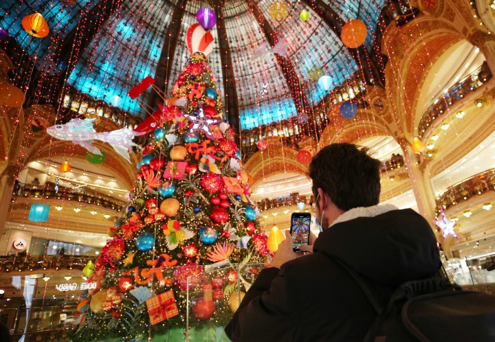 11月28日,一名男子在法国巴黎老佛爷百货商店用手机拍摄巨型圣诞树。受疫情影响关闭了近一个月的老佛爷百货商店于当日重新开业。新华社记者高静摄