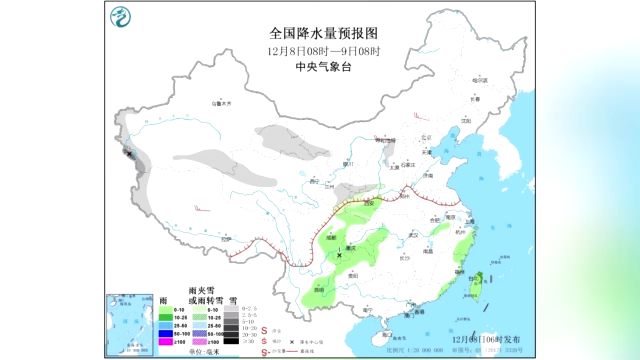 昨天,甘肃南部、陕西关中及新疆沿天山一带等地部分地区出现小雪或雨夹雪。中央气象台消息显示:今早(8日)8时至9日8时,新疆西部和南部山区、西藏西北部、甘肃北部和南部、陕西南部、山西西北部等地的部分地区仍有小雪或雨夹雪,其中新疆西南部山区局地大雪。未来三天,上述地区仍以雨雪天气为主,西南地区东部和南部则多阴雨天气,降雨量以小雨或阵雨为主。