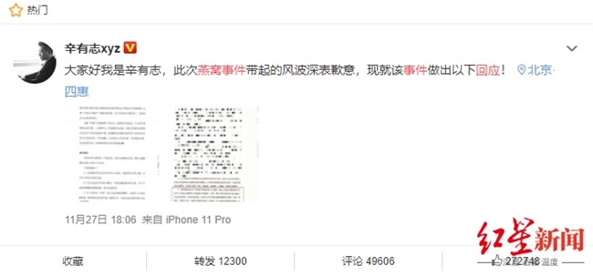 11月27日,辛有志通过社交平台发布一篇声明,表示经检测直播间销售的燕窝确实存在夸大宣传——燕窝成分不足每碗2克,对此其表示道歉,并向购买燕窝的消费者承诺“退一赔三”,共赔付6198万元。