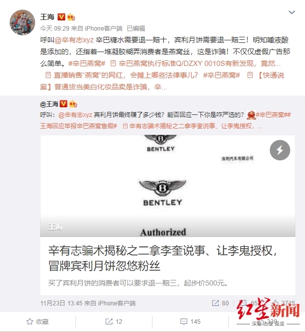 “职业打假人”王海告诉红星新闻记者,长期以来他一直在关注燕窝骗局的相关事件。他注意到,一名消费者反映在辛巴直播间买到的燕窝实际上是糖水,并在网上发文称怀疑辛巴团队销售的其它产品也涉嫌造假,其中包括“假冒敖东研发的牙膏”、“检不出马油的马油皂”等。