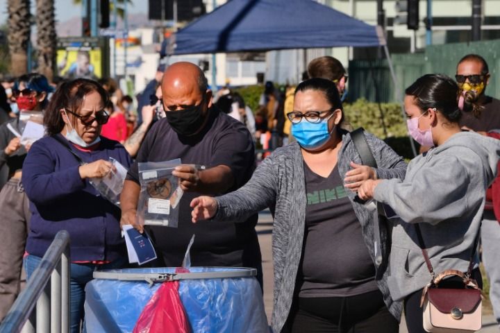 12月5日,在美国加利福尼亚州洛杉矶一处新冠病毒检测点,人们检测后将用过的工具包投入回收容器内。由于连日来新冠疫情恶化导致医疗体系面临重压,美国加利福尼亚州公共卫生部门5日宣布,包括加州南部以及加州中部部分地区在内的广大区域将从当地时间6日23时59分开始实施“居家令”。新华社/美联
