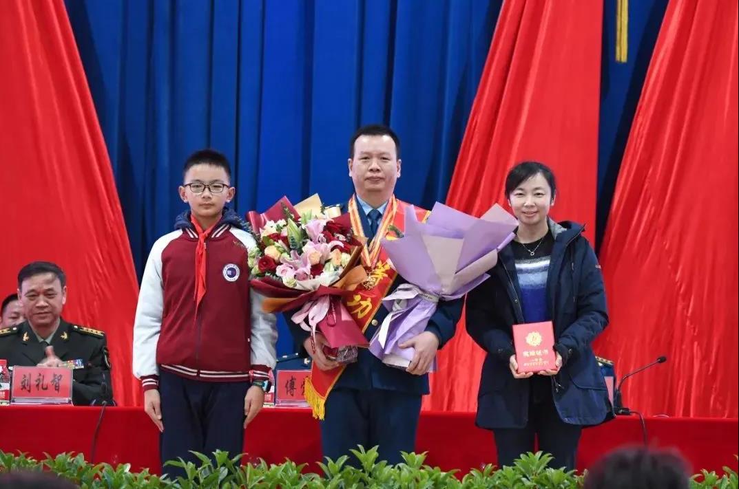 在现场,王建东妻子也应部队邀请,和近千名官兵一同见证这一光荣时刻,并亲自上台为丈夫整理胸前奖章。