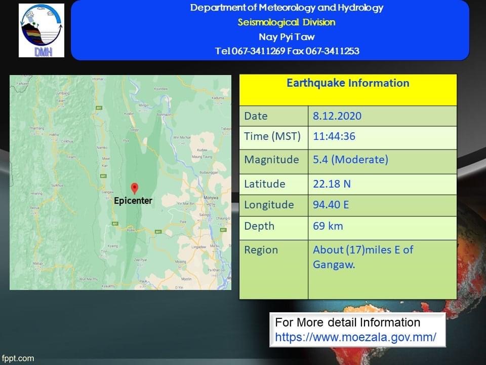 据缅甸水文与地震局消息,当地时间11月8日上午11时44分,缅甸马圭省发生5.4级地震。震中位于甘高镇以东27公里(东经94.4度、北纬22.18度),震源深度69公里,目前暂无人员伤亡消息。(总台记者 王悦舟)