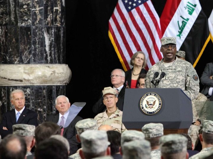 2010年9月1日,在伊拉克首都巴格达国际机场附近的驻伊美军基地,驻伊拉克美军新任最高司令奥斯汀在驻伊美军任务转换仪式上讲话。当日,时任美国副总统拜登(左)主持了美军任务转换仪式,宣布2003年起的“自由伊拉克行动”正式被“新黎明行动”取代。新华社记者徐俨俨摄