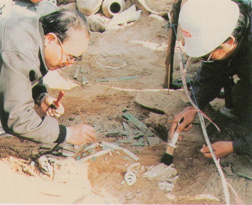 翻拍图片:考古人员在清理新干大洋洲商代大墓随葬玉器。(彭建新 摄)