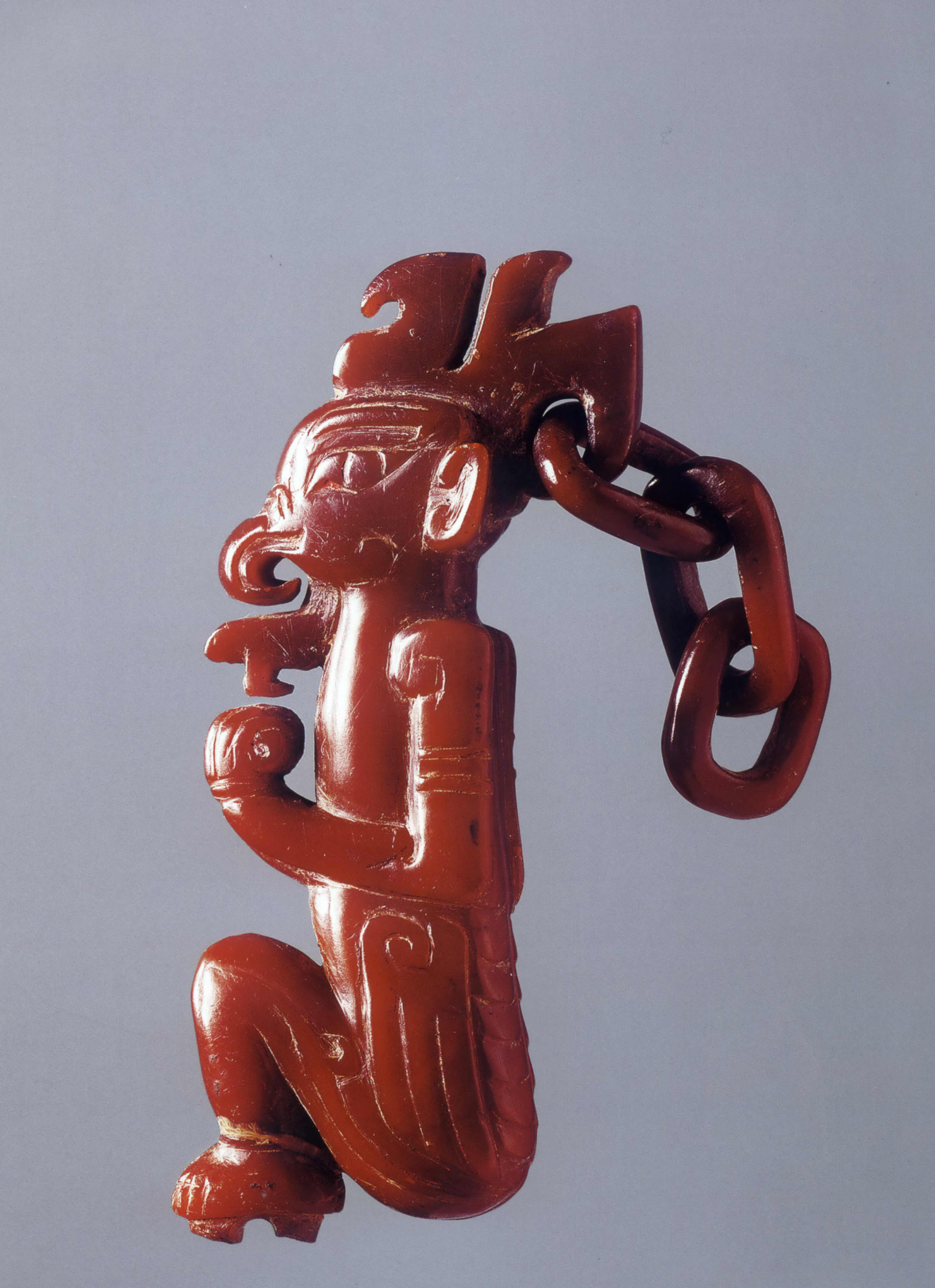 馆藏于江西省博物馆的商代活环曲蹲羽人玉佩饰,通高11.5厘米、身高8.7厘米、背脊厚1.4厘米。叶腊石类质,色呈枣红。羽人造型,作侧身屈臂蹲坐。首如鸟形,圆眼粗眉,嘴微微张口,“C”形大耳,顶上扉棱状的高凸冠,顶后部连系三个相套环形成的短链。身亦人亦鸟,体形如人,两臂屈于胸前,拳心朝内,双膝弯曲蹲坐。身体两侧各雕一翼,脊背雕刻层叠的羽纹。