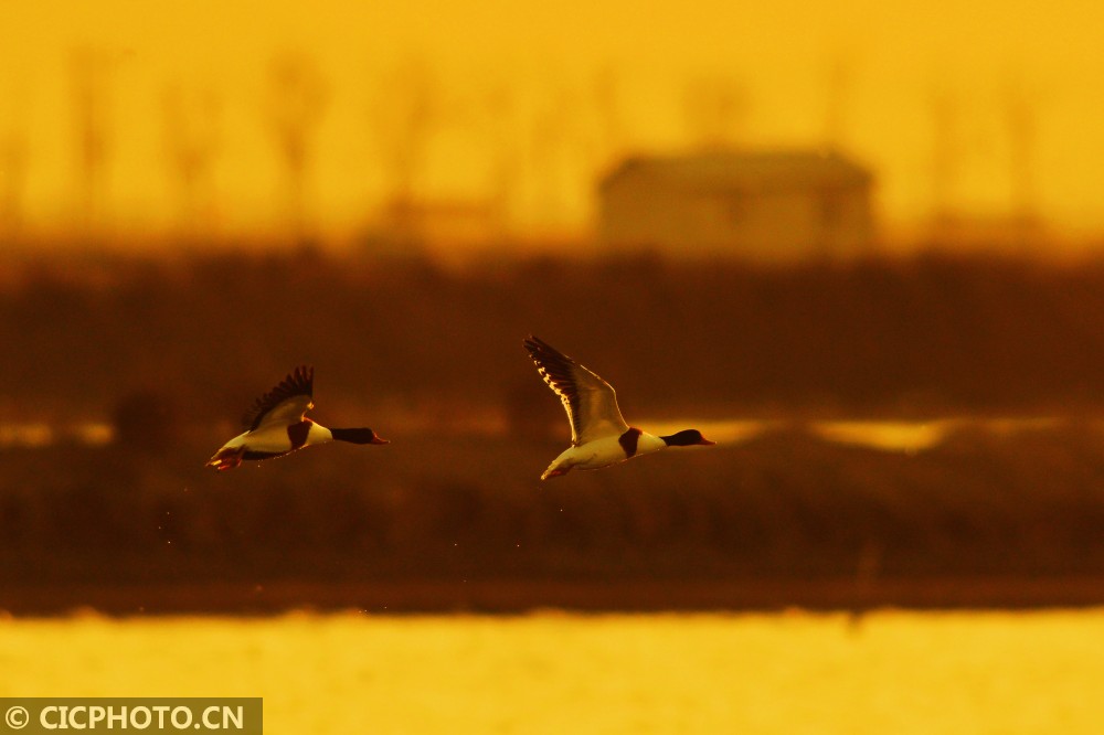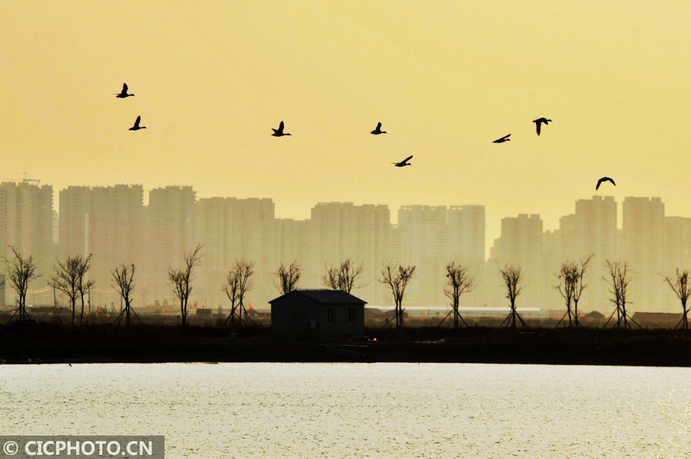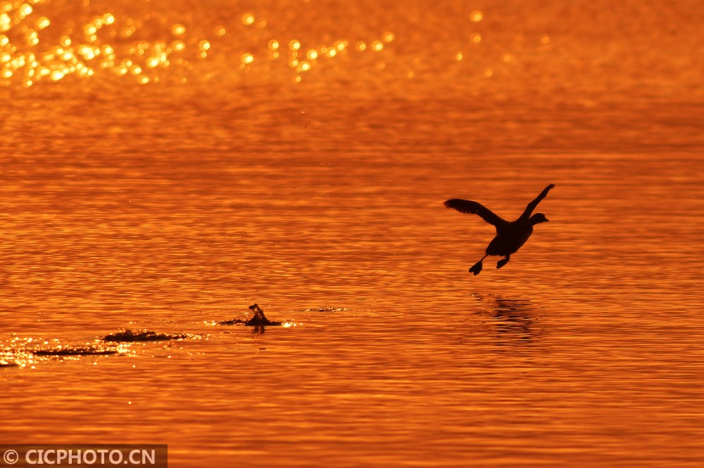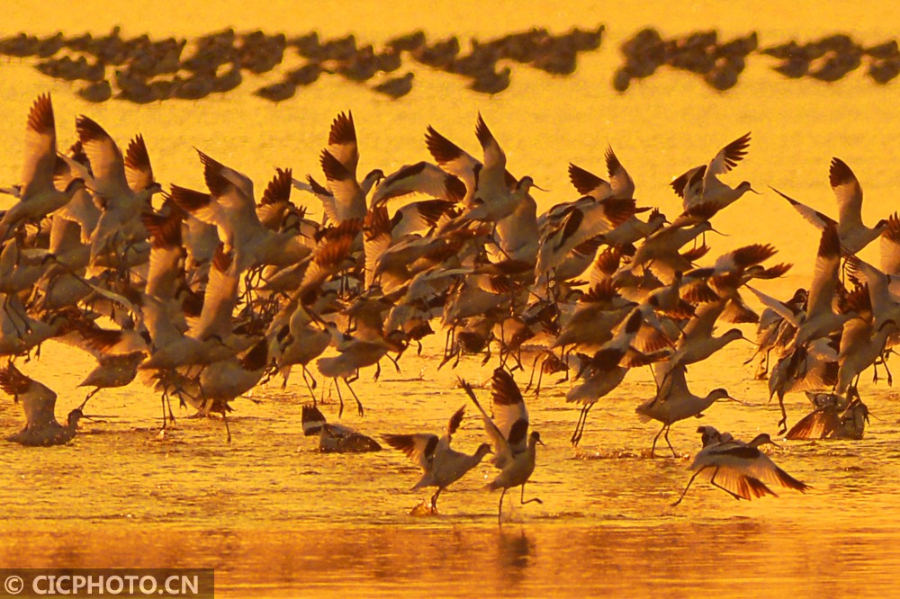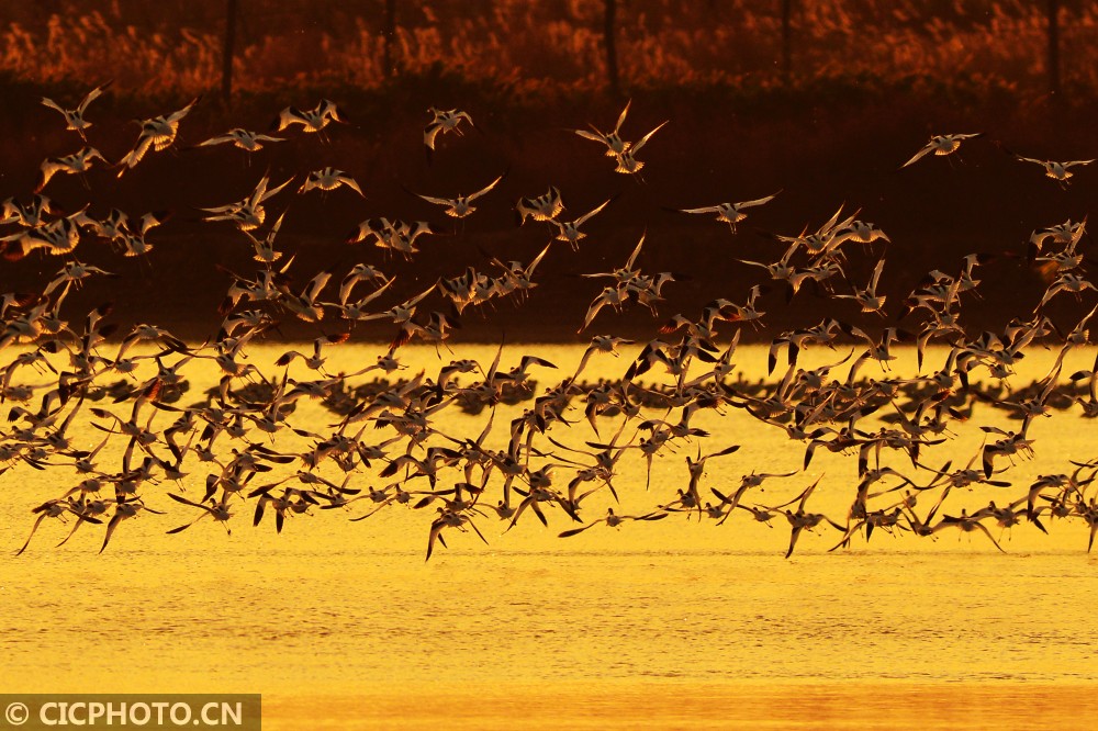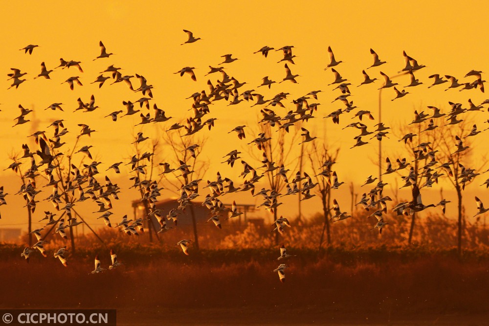 进入大雪节气,不少候鸟来到山东省青岛市城阳区河套湿地越冬,大批反嘴鹬在夕阳的辉映下振翅起舞,展现出一幅自然和谐画面。