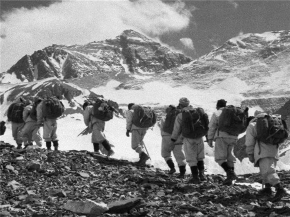 ↑1960年5月25日,中国登山队运动员王富洲、贡布(藏族)、屈银华3人首次集体安全地从东北山脊登上世界最高峰珠穆朗玛峰,开创了人类从北坡登顶的先例。图为王富洲(右一)、贡布(藏族)、屈银华。