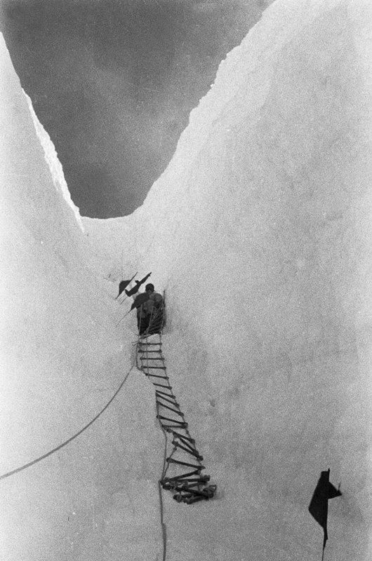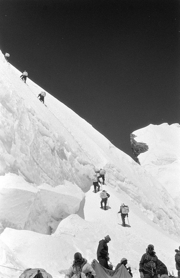 由于北坳本身地形的关系,侦察小组找到的这条路线,虽然绝对避免了冰崩和雪崩的危险,但是沿途坡度很大,冰裂缝也较多,势必还会给登山队员们带来不少困难。因此,在侦察小组结束侦察活动以后不久,遵照登山队队部的决定,副队长许竞又率领了一支修路队伍直上北坳,对道路进行整修,以保证大队顺利通过。