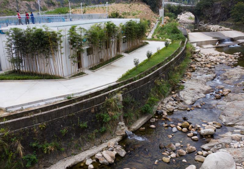 图为9月4日,刚刚投运的浙江省杭州市临安区清凉峰镇白果村生活污水处理站点,经过处理后达标的水直接排入小溪中,用于农业灌溉(无人机照片)。