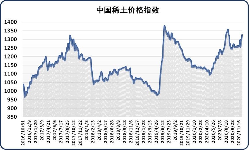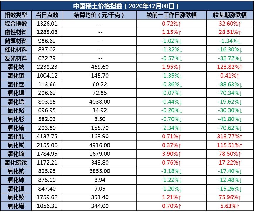 新华财经北京12月8日电(刘星麟)8日,中国稀土价格指数报1326.01点,较前一工作日上涨9.45点,涨幅为0.72%。氧化铽价格上涨,市场流通现货有限,上游分离厂家信心较强、报价坚挺,下游企业谨慎采购,整体成交量较少。