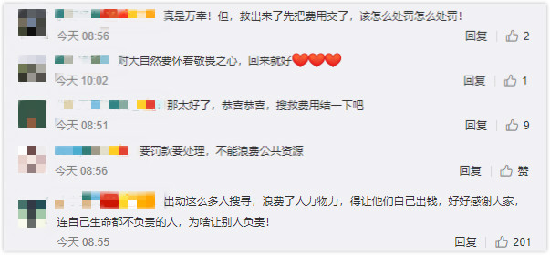 15位驴友平安无事,网友表示万幸之余,得先把费用交一下,浪费了人力物力,得让他们出钱。