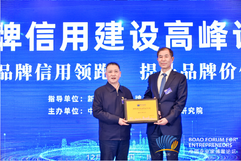 图为新华社民族品牌工程办公室常务副主任、新华社印务有限责任公司董事长宗焕平(右)向重庆市璧山区副区长罗志军授予“信用领跑行动城市合作伙伴”证书