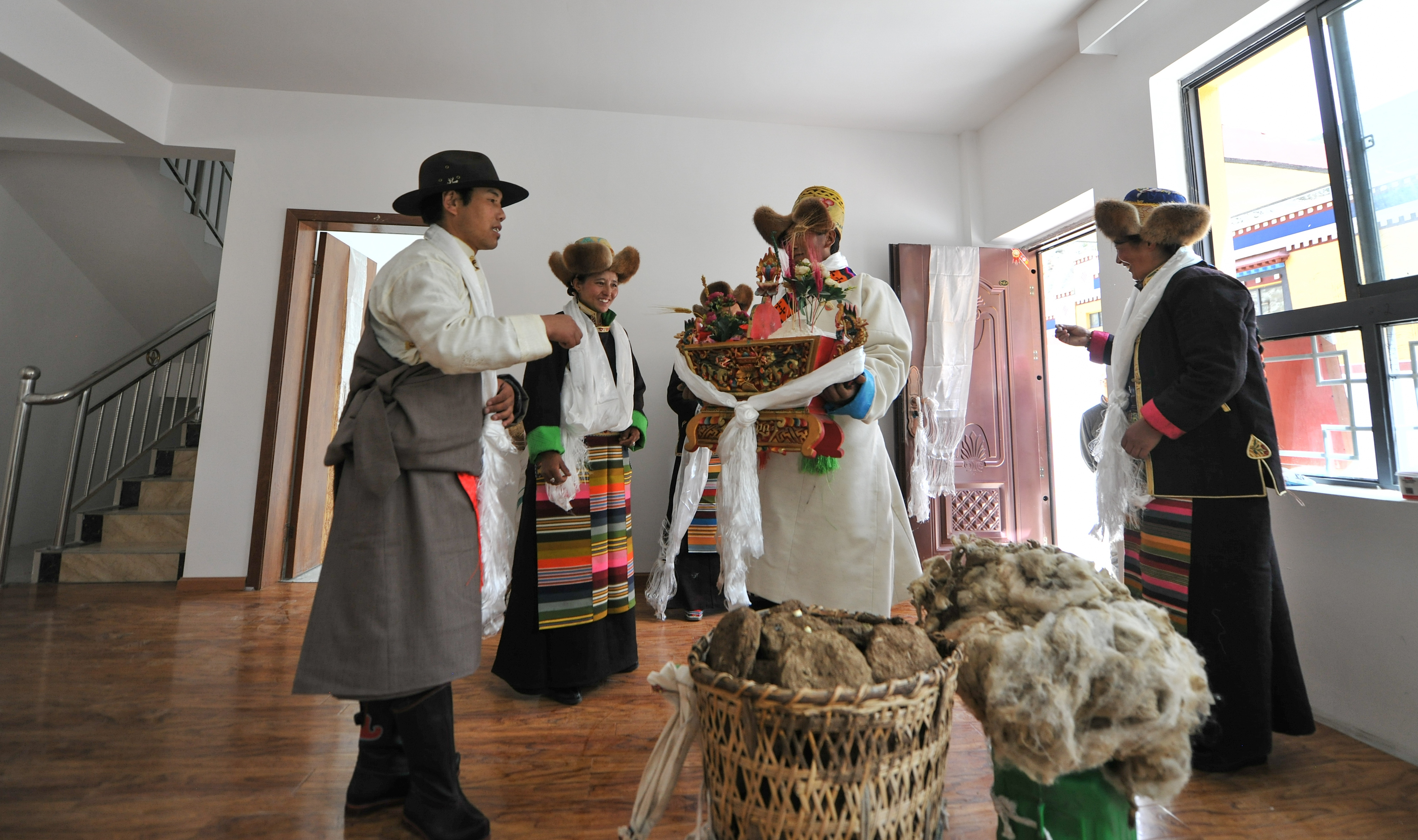 西藏山南市洛扎县洛扎镇居民在举行乔迁新居传统仪式(2019年9月21日摄)。新华社记者 晋美多吉 摄
