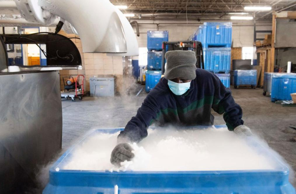 △2020年11月20日 一名员工在干冰工厂制造干冰颗粒
