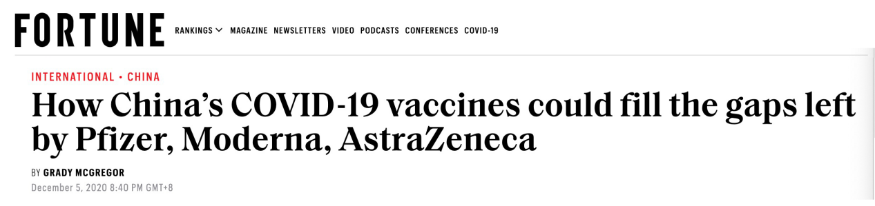 △《财富》杂志报道:中国新冠疫苗如何填补辉瑞、摩德纳以及阿斯利康的空缺