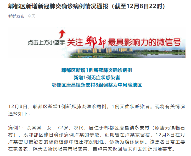病例1:佘某某,女,72岁,农民,居住于成都市郫都区唐昌镇永安村(原唐元镇临石村),系郫都区昨日确诊病例卢某的亲戚,近期曾在卢某家留宿。12月8日在对卢某密切接触者的隔离检测中检出核酸阳性,诊断为确诊病例。该患者日常主要在家务农,隔天去新民场菜市场卖菜,自卢某家返回后未再去过新民场菜市。