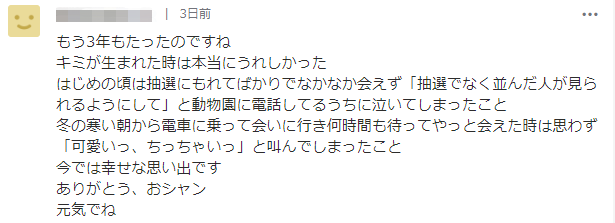 也有日本网友在社交媒体上回忆起去看“香香”的快乐时光:在冬天寒冷的早晨坐电车去见你,等了好几个小时之后终于看到了你的样子,不由自主地叫到:“好可爱,好小啊......”现在依然是幸福的回忆!谢谢你,一定要保重。