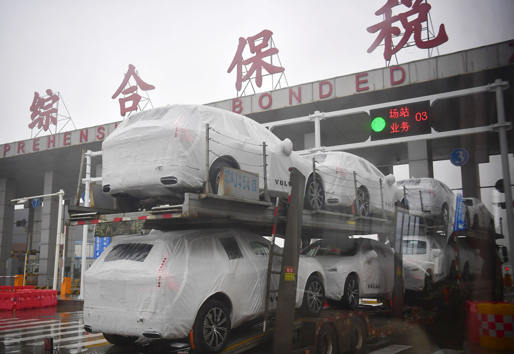 12月2日,货车运载在国内生产的沃尔沃汽车进入西安国际港务区综合保税区。这些汽车即将搭乘“长安号”中欧班列销往欧洲。新华社记者 邵瑞 摄