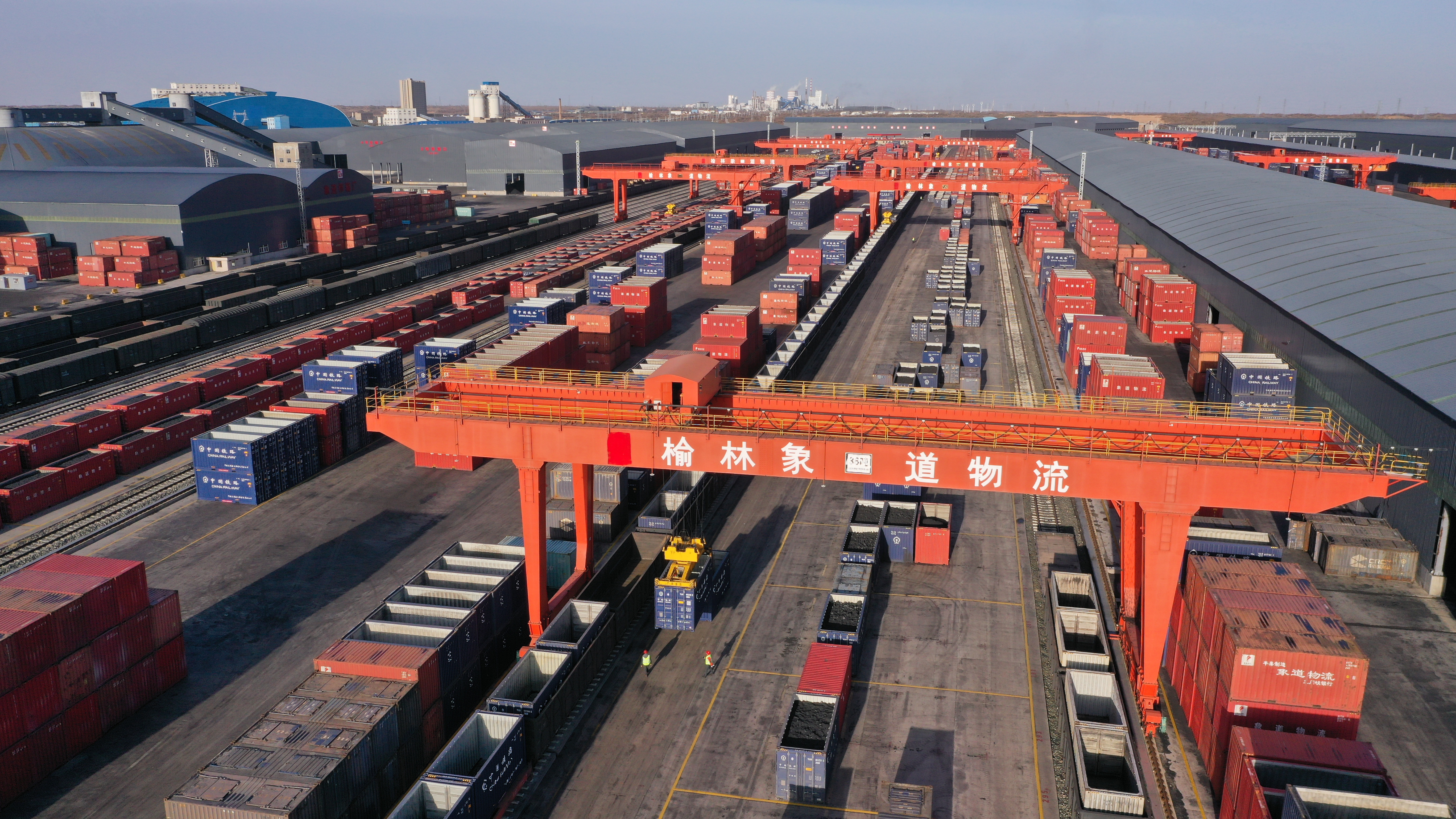 图为陕西榆林象道国际物流园集装箱装卸区,员工在指挥装卸外运煤炭。新华社记者陶明摄