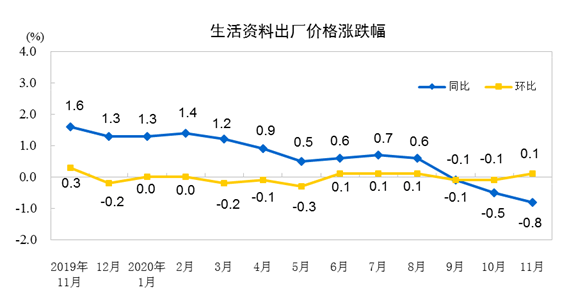 2020年11月份,全国工业生产者出厂价格同比下降1.5%,环比上涨0.5%;工业生产者购进价格同比下降1.6%,环比上涨0.7%。1—11月平均工业生产者出厂价格比去年同期下降2.0%,工业生产者购进价格下降2.5%。