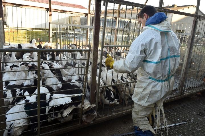 2017年1月6日,在法国西南部的贝洛克-圣克拉芒,为防止禽流感疫情扩散,家禽养殖场的工作人员准备扑杀鸭子。新华社/法新
