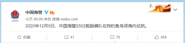 2020年12月9日,中国海警2502舰艇编队在我钓鱼岛领海内巡航。
