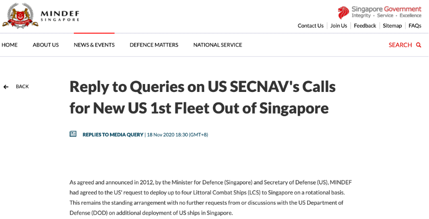但对于美方提议,新加坡官方并不热情。新加坡国防部于当地时间11月18日晚,通过官方网站发布简短声明表示,美国国防部没有提出在新加坡增加部署舰艇的要求,新加坡也没有同美方进行相关讨论。