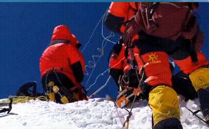 在顶峰应该是持续一个小时的工作,持续到两个半小时。最后决定登山队员要把所有的背上去的装备再背下来,我们所有的测量队员和登山队员光荣地完成了这个任务,我觉得真的很感动。我们的登山队员、测量队员就是我们当代的英雄。