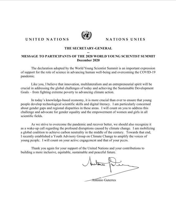 联合国秘书长安东尼奥·古特雷斯给世界青年科学家峰会参会者的亲笔信截图。