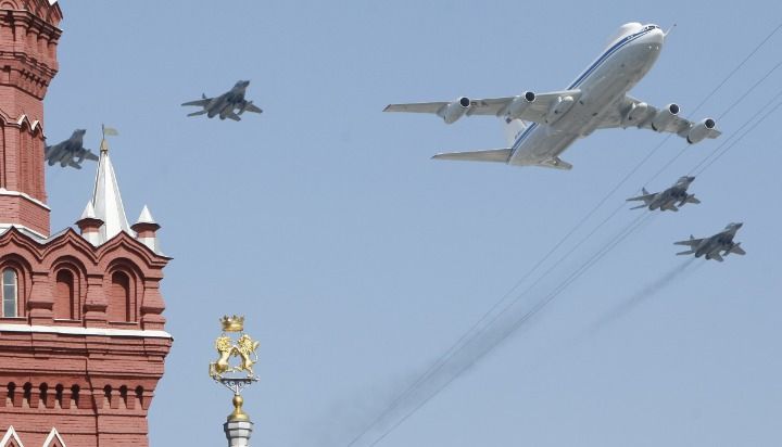 2010年5月9日,在俄罗斯首都莫斯科,伊尔-80特种指挥机和米格-29战机方队飞过红场上空。新华社记者鲁金博摄